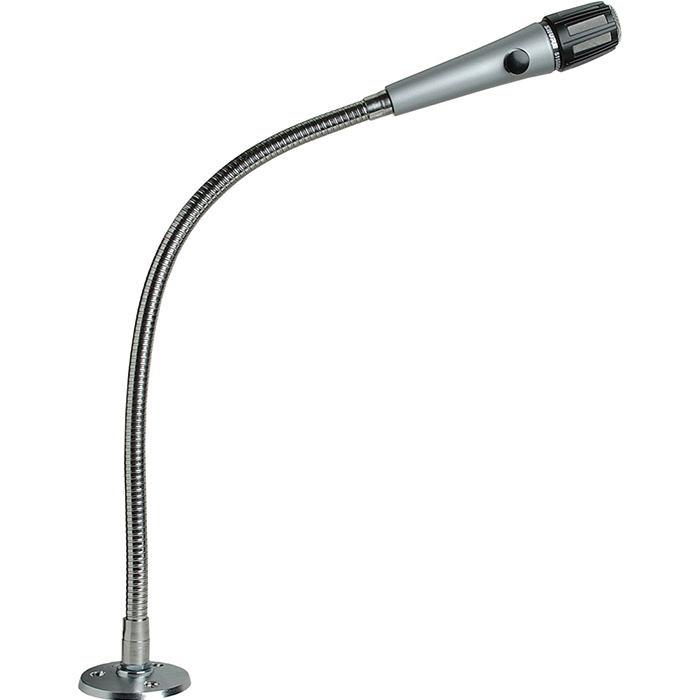 Integrated flexible gooseneck and mounting flange allow for hands-free operation, ready to install, for use in paging and base station communications systems.