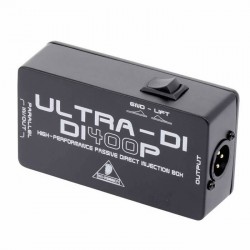 ULTRA-DI DI400P, gitar, bas ya da klavyeyi miksere doğrudan bağlamak için bir pasif DI (direkt enjeksiyonlu) kutusudur. DI400P, arabuluculuğu ile empedans eşleştirme sorunları geçmişte kaldı ve artık uzun kablo kaçakları yüzünden değerli ses tonlarınızı kurban etmeyeceksiniz.